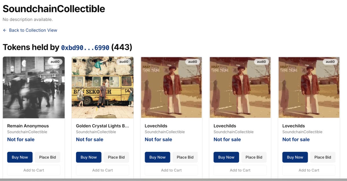 getTokensForCollection(contractAddress: string, network: string, options?: { limit?: number, owner?: string }): Promise<AudioNft[]>ParameterDescriptionRequiredExamplecontractAddressThe address of the NFT contract.true’0x7dc6c8e6dcc6d21d679397489785b8373b31d0ed’networkThe network to query (e.g., ‘eth-mainnet’, ‘polygon-mainnet’).true’eth-mainnet’optionsAn object for additional options.false{ owner: ‘0x123...’ }Example: